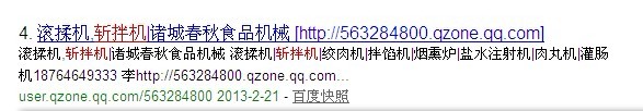 隨著社會(huì)化網(wǎng)絡(luò)的盛行,百度也越來越關(guān)注這方面的發(fā)展。不知道大家發(fā)現(xiàn)沒有,很多微博或者是QQ空間的內(nèi)容都會(huì)被百度收錄,這在之前是從來沒有聽說過的事 情。不過大家可能多數(shù)都是看到的是一些網(wǎng)絡(luò)名人或者明星的空間或者微博,其實(shí)利用QQ空間或者微博來做排名的也在有人在。本人無意中發(fā)現(xiàn)的,大家可以在百 度搜索“斬拌機(jī)”,找到自然排名第四的網(wǎng)站,上圖給大家看看: